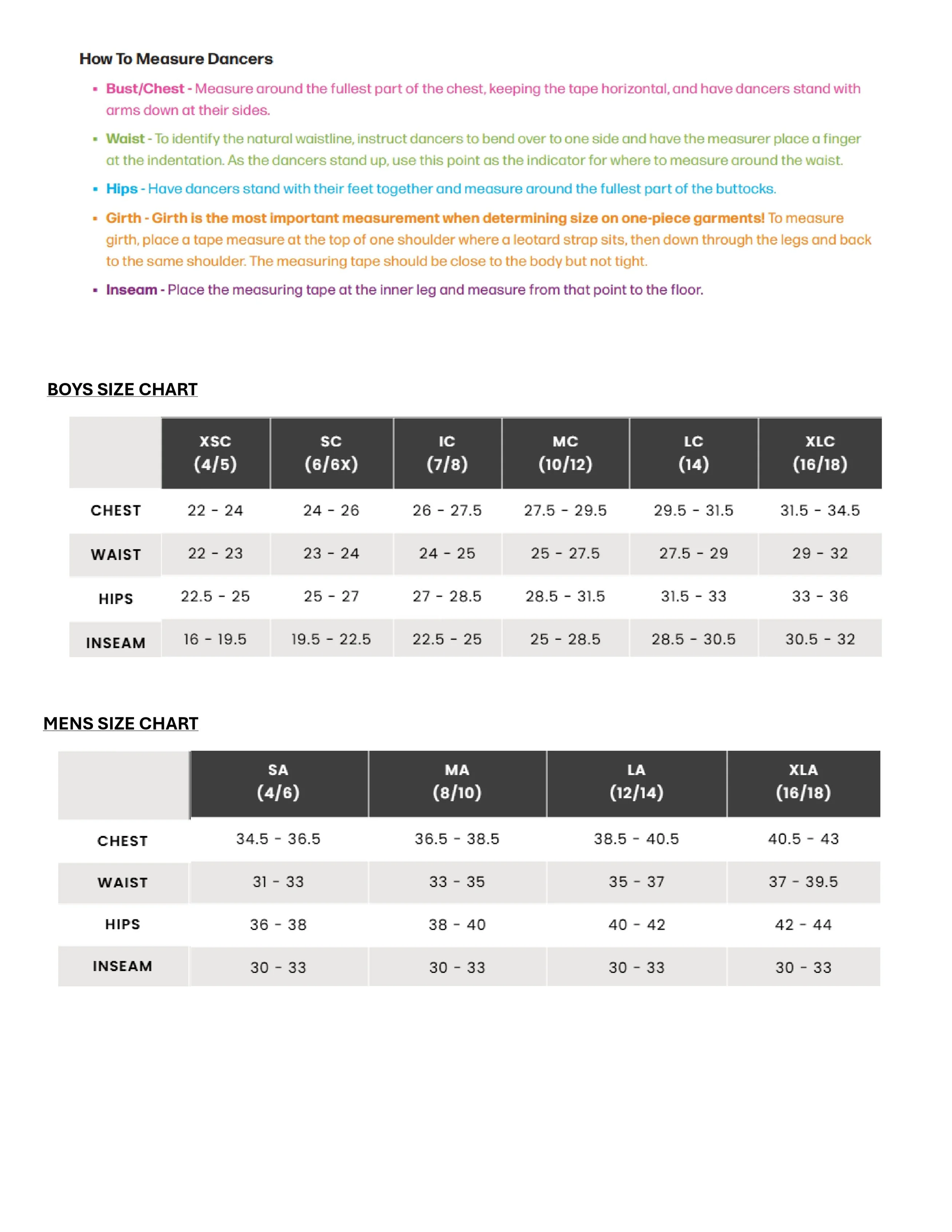 **PLEASE CONSULT THE SIZE AND MEASUREMENT CHART TO SELECT THE CORRECT SIZE FOR YOUR CHILD. ***IT IS VERY IMPORTANT TO KEEP IN MIND THAT THE RECITAL IS IN MAY 2025 AND YOUR CHILD MAY GROW BY THEN. IT IS BETTER TO SELECT ONE SIZE LARGER AS MAKING A COSTUME SMALLER IS MUCH EASIER THAN MAKING IT BIGGER! (THERE ARE NO RETURNS OR REFUNDS, AND WE ACCEPT NO RESPONSIBILITY FOR SIZES ORDERED).